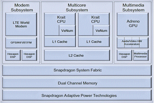 As an example of a multicore design, shown below is Qualcomm's Snapdragon.