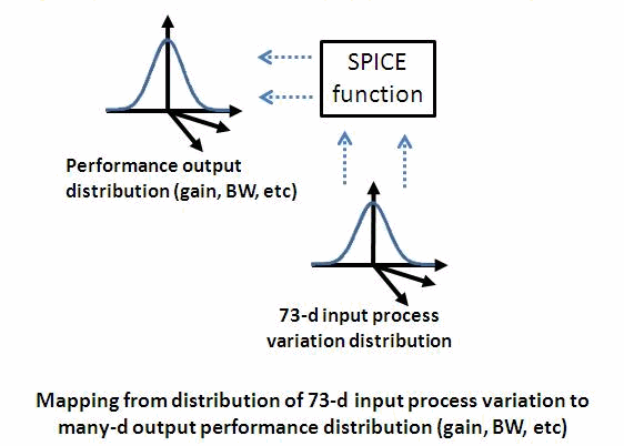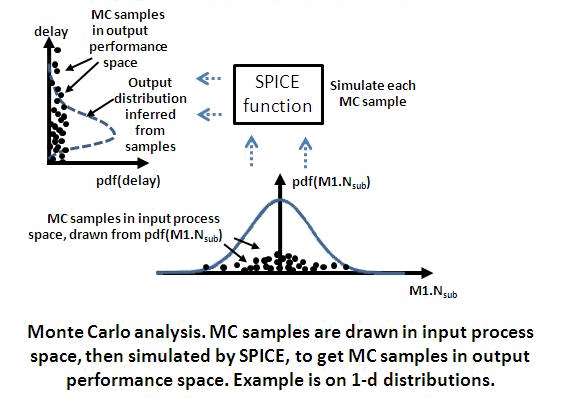 process variation space, mapped by SPICE to MC samples in *output*