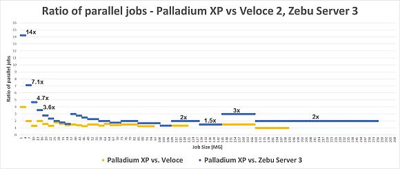 On average across the 10MG to 256MG SW job size range, the Palladium XP runs