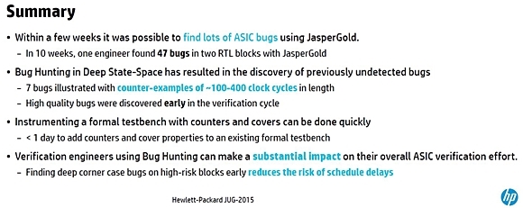 All formal tools use these basic algorithms; but most use variants on these themes to eother boost either runtime or capacity. For example, Bounded Model Checking (BMC) is great for bug-hunting -- finding CEXs deep in the design's state-space (rather than achieving property convergence) but to go *really* deep in the state-space you need Elastic BMC which is: - automatic helper assertions, - guidepointing (using cover points to guide the bug search), - and searchpointing (random constraint solving). Jim missed that our JasperGold does all three of these -- plus it has a set of new ABV engines to hit "quality" bugs that no other commercial validation techniques can find. (That's 4 more Hogan Omissions.) An HP case study from JUG 2015 backs this: