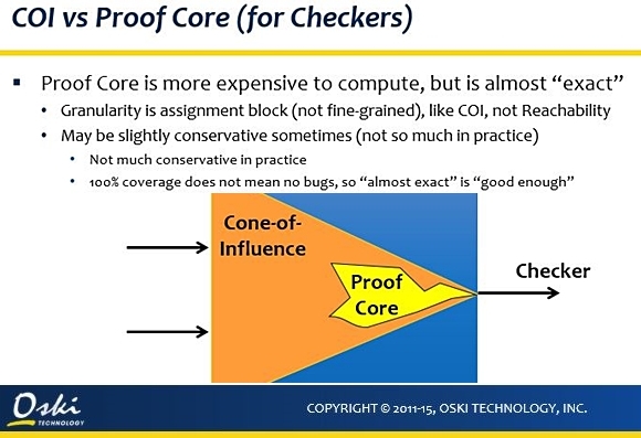 This is *NOT* what ProofCore does. Instead what Jim Hogan described is basic structural analysis of property coverage, which tends to be over-optimistic. It's just a guideline. Its purpose is to highlight areas you definitely haven't covered with properties. No more. ProofCore does much, much more. It takes engine-level information about the contents of the COI that were actually proven by each assertion. ProofCore is much more accurate. Just ask Vigyan Singhai (Oski) and Vikram Khosa (ARM), they know. ProofCore provides the most accurate measure for formal coverage on both bounded and unbounded proofs -- which is unique to CDNS Jasper. No one else does this.