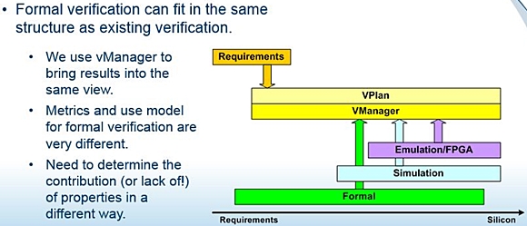 7. FORMAL-SIMULATION INTEROPERABILITY Because Formal ABV today is used alongside simulation, the interoperability between the two is important. A major issue is understanding which parts of your design that are covered by the simulation or formal tools. This has been a problem because the coverage models between the two are different. A number of simulators like Synopsys VCS, Cadence Incisive, Mentor Questa. Aldec Rivera, Silvaco Silos, Fintronic Finsim, Synapticad Verilogger, Winterlogic Z01X, Tachyon CVC and others all have links to formal -- mostly through their coverage mechanisms. Caveat: your formal tool along with your simulator will output a boatload of coverage metric data. This coverage information needs to be loaded into a common database and viewed with a verification planning tool to assess what overall progress you're making on your chip. It is too easy to lose data between the two different methods if you don't do this! Some vendors allow for their databases to be read and written in a limited fashion from your formal and simulation tools, including third parties; but you must ask each vendor exactly which tools it does or does not support.