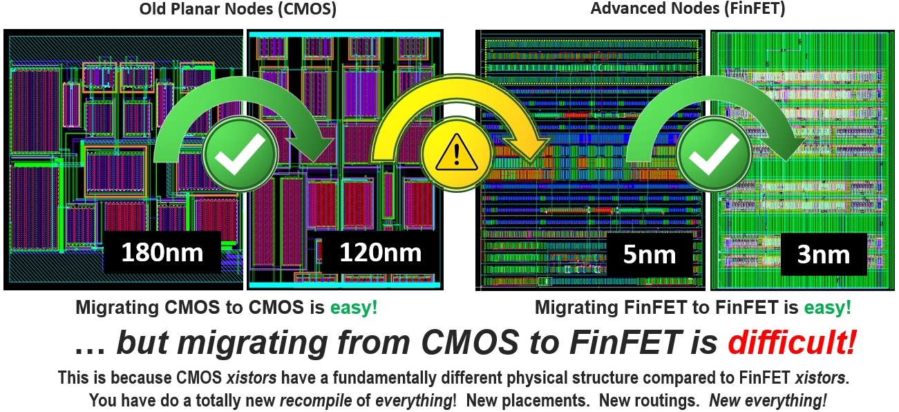 massive CAD support. Every new CMOS process migration was a TON OF WORK. Meh.