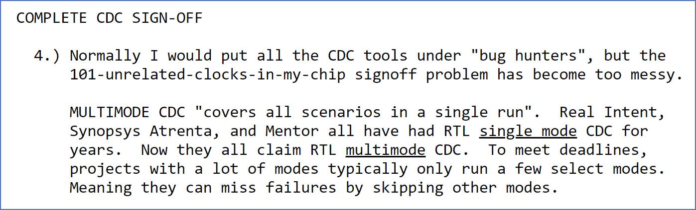 We have a formal clock domain crossing sign-off methodology. Part of